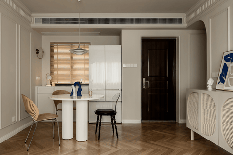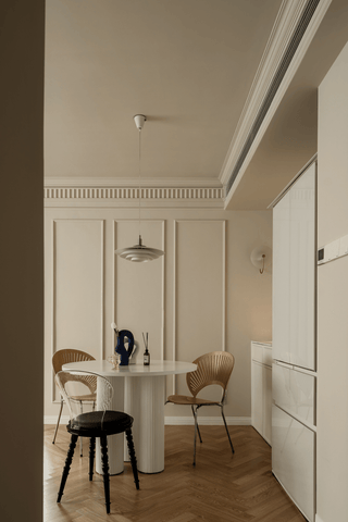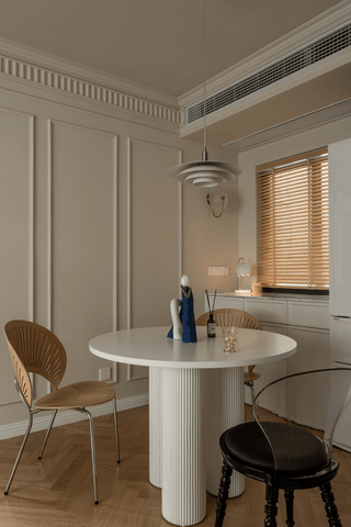 Der Essplatz kann in jedem Stil gestaltet werden, aber wir müssen darauf achten, dass er im Geiste des Minimalismus gemacht wird: ein wenig Möbel, nur das, was wirklich gebraucht wird, Weiß, Grau, Schwarztöne, Naturtöne, Metall Chrom Elemente.