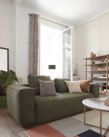 Wir können das grüne Cord-Broch-Sofa wählen. Dies ist ein sehr beliebter Stoff und Farbe: grüner Cord. Daher ist es in diesem Herbst und Winter ein Schlüsselelement, um Ihr Wohnzimmer zu 100% retro zu machen. Natürlich können Sie beispielsweise bei Kissen und Poufs verschiedene Farben wählen, die Ihr Wohnzimmer modischer machen.